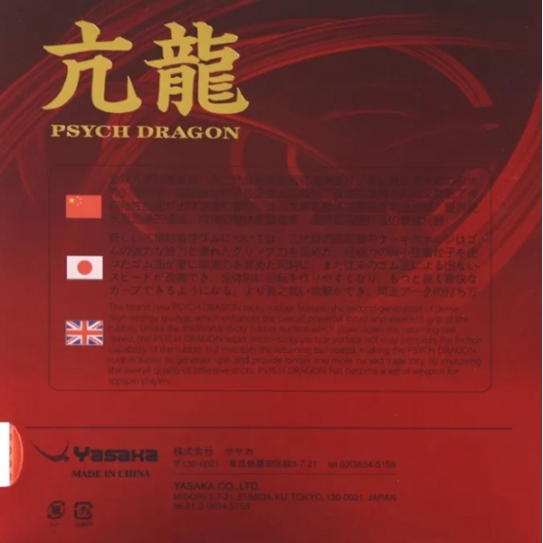 Upgrade your game with the Yasaka Psych Dragon! This revolutionary tacky rubber features a dense sponge for maximum power and a micro-particle surface for exceptional grip. Experience longer, more consistent arcs and devastating attacks.